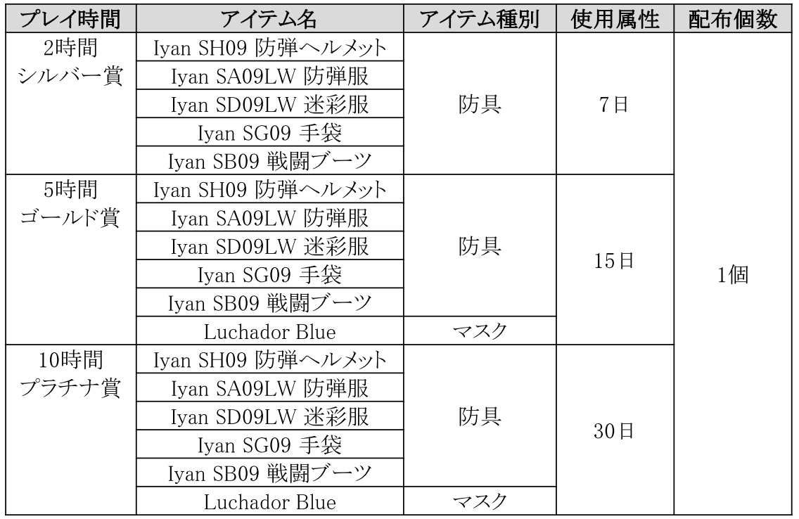 期間中、対象MAP・モード・チャンネルで試合終了画面(リザルト画面)が表示されるまでプレイすると、プレイ回数に応じたアイテムをもれなくプレゼントします。さらに、プラチナ賞を受賞された方の中から抽選で10名様に「XM8 Anodizing(永久)」をプレゼント!