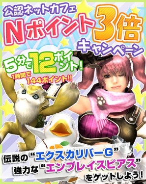 2014年10月15日(水)メンテナンス開始まで、公認ネットカフェにおいて「Nポイント3倍キャンペーン」を開催いたします。期間中、通常5分につき4ポイントのNポイントが3倍の5分につき12ポイント(1時間で144ポイント)獲得できます。