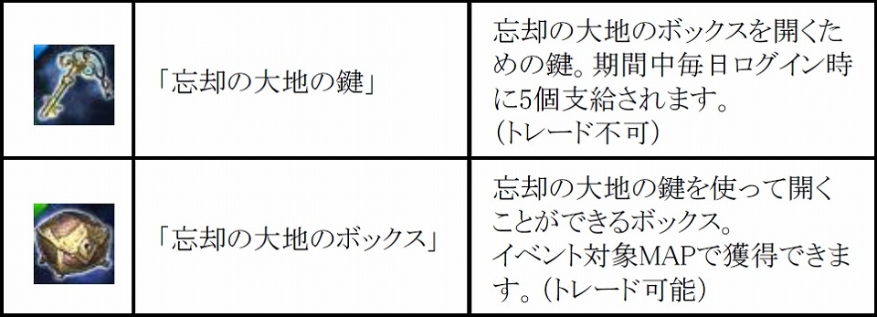 イベント期間中、対象となるインスタンスダンジョンのボスモンスターを討伐すると「忘却の大地のボックス」がドロップします。「忘却の大地のボックス」を開けるには、アイテム「忘却の大地の鍵」が必要となります。