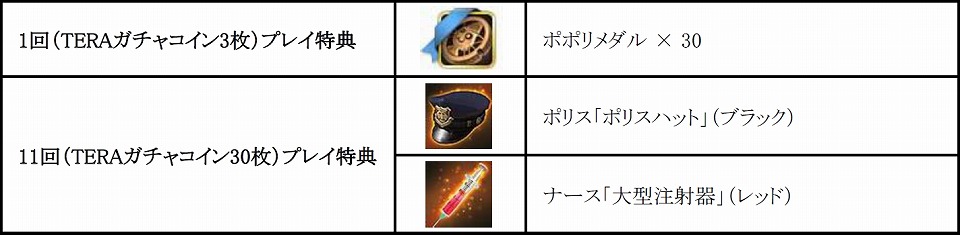 本日2014年10月8日(水)より「TERAガチャ」に「ハロウィンパーティ2014」アバターが期間限定で登場いたします。「ハロウィンパーティ2014」アバターは、「ポリスコスチューム」と「ナースコスチューム」といったハロウィンを盛り上げるアバターをはじめ、強化アイテムなど様々なアイテムが当たります。ぜひチェックしてみてください。