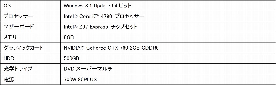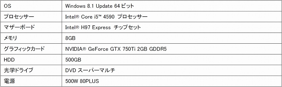 「GS5150-i5-NXB-TERA」はプロセッサーにCore i5-4590、グラフィックにGeForce GTX 750 Ti、メモリに8GB、500GB のHDD、OS にWindows 8.1 Update を搭載したコンパクトゲームパソコンです。「GS7100-i7-RXB-TERA」はプロセッサーにCore i7-4790、グラフィックにGeForce GTX 760、メモリに8GB、500GB のHDD、OS にWindows 8.1 Update を搭載したミドルタワーゲームパソコンです。