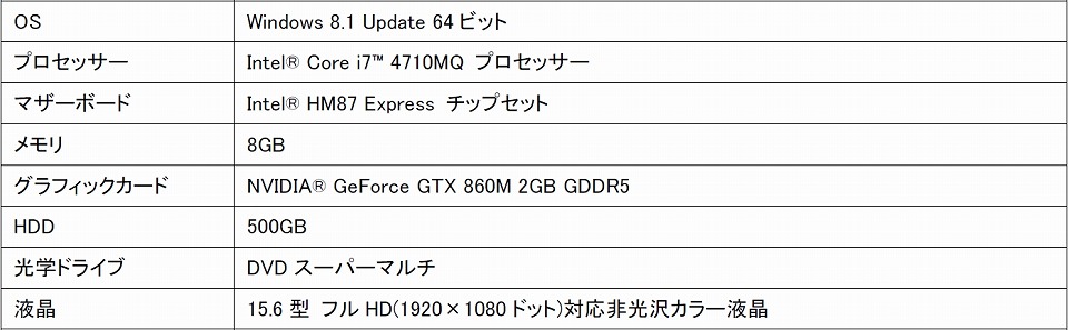 「15GSX7100-i7-REB-TERA」はプロセッサーに Core i7-4710MQ、グラフィックに GeForce GTX 860M、メモリに 8GB、500GB の HDD、OS に Windows 8.1 Update を搭載した 15.6 型ゲームノートパソコンです。