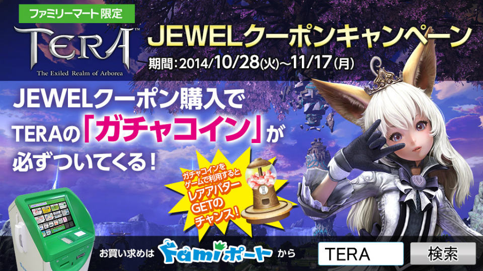 ゲームオンは、ファミリーマート、ファミマ・ドット・コムと協力し、「TERA」で使用できるガチャコインのシリアルコードがもらえる「【ファミリーマート限定】TERA JEWELクーポンキャンペーン」を本日10月28日より開始した。