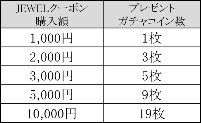 ※ガチャコイン枚数に関わらず、JEWELクーポンに印字されるシリアルコードは1つとなります。