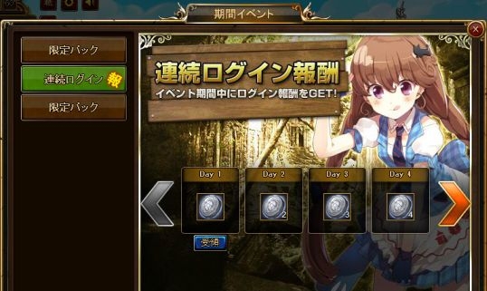 下記の日程にて「ログインキャンペーン(10/29~11/26)」を実施いたします。期間中、1日1回ゲーム内にログインすると、ログイン日数が+1されます。ログイン日数に応じてプレゼントが入手できます。ログインキャンペーンの画面は、メイン画面左の「期間限定」から開くことができます。