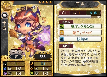 黄巾の長、張角に仙術を授けた仙人・于吉。物腰穏やかで神秘的な魅力を崩さない彼女も、ひとたび武将としてマウンドに立てば、艶めかしい外見と魅了の術で多くの選手を惑わす魔女となる。