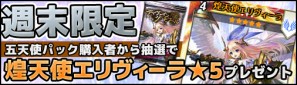 2014年11月14日(金)16:00 から 2014年11月16日(日)23:59 までの期間中に「五天使パック」をご購入頂いた方限定で「煌天使エリヴィーラ(★5)」が抽選で当たる「週末限定!抽選で煌天使エリヴィーラプレゼント!」キャンペーンを実施いたします。