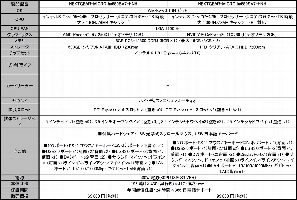 抜群のコストパフォーマンスを誇る「NEXTGEAR-MICROシリーズ」より、インテル Core i5-4460 プロセッサー、8GBメモリ、500GBハードディスク(7200rpm)、AMD Radeon R7 250X、インテル H81 Express チップセット採用microATXマザーボード、500W電源、Windows 8.1 Update 64ビットをプリインストールした「NEXTGEAR-MICRO im550BA7-HNH」が6万9,800円(税抜)。