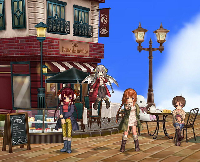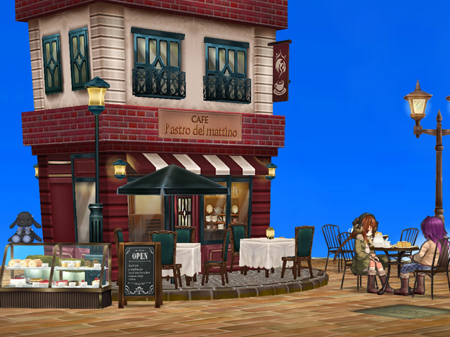 「オープンカフェ」「カフェのショーケース(茶)」や「浪漫のガス燈(茶)」「スタッフドドッグ(大)」「カフェテーブル(こげ茶・パンケーキ)」「サインボード(黒)」で自分だけのお家「飛空庭」を飾れば、ちょっとオシャレなストリートのカフェを演出できちゃう。