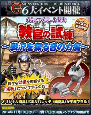 オリジナル防具「ポボルバレッタ」(頭防具)の生産素材が入手できるG6実装記念イベント「教官の試練~戦況を操る音の力編~」を開催いたします。