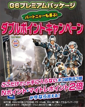 ※キャンペーン期間中に対象のイベントコードを入力いただくと、「MHF-G6 プレミアムパッケージ」の特典16、17の内容と合わせて合計でマイトレポイント60P、Nポイント500Pが配布されます。