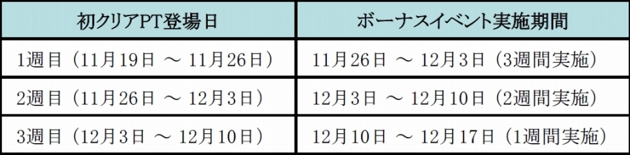最速クリアパーティーが登場した週に応じて、全サーバー対象のボーナスイベントを開催いたします。初クリアが早ければ早いほど、ボーナスイベントの期間が長くなります。