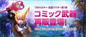 本日2014年11月19日(水)より「TERAガチャ」に武器アバターとなる「コミック武器」がが期間限定で再登場いたします。ぜひチェックしてみてください。