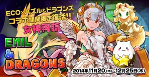 「エミル・クロニクル・オンライン」と「パズル&ドラゴンズ(パズドラ)」のコラボレーション「EMIL & DRAGONS」が復活!パズドラの人気モンスター「戦乙女・プリンセスヴァルキリー」がECOのパートナーアイテムとして再臨します!また、コラボ期間中はパートナーアイテム「フェアリオン」とエフェクト装備「たまドラ」もゲットできます!!ECOのゲーム内のイベントを進めるだけで、どなたでも手に入りますのでこの機会にぜひゲットしちゃおう!