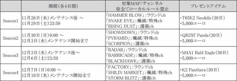 期間中の各Season4日間で、対象の3マップをそれぞれ3回以上プレイすると、過去のアニバーサリー銃器(30日)と5,000ユーロがもらえる!さらに、4つのSeaoson全てで各対象の3MAPを3回以上プレイすると、なんと「Type89 Pheasant(永久)」と10,000ユーロをプレゼント!