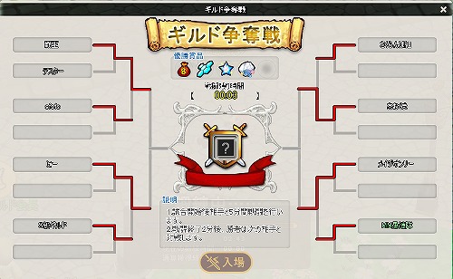 開催時間になると参加ギルドメンバーにはギルド争奪戦へ入場するか確認するウィンドウが表示されます。また、開催時間中にギルド争奪戦のアイコンをクリックするとトーナメント表が表示されますので、こちらからも入場が可能です。