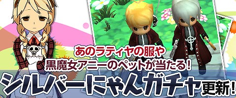 シルバーにゃんガチャの内容を更新しました!初の人型ペット「黒魔女アニー」やあのラティヤの服が追加されました!