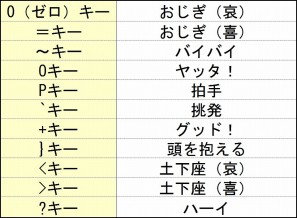 操作方法は、キーボードの「k」キーを押すか、「Alt」キーでメニュー画面を開き、「システム」→「設定」→「操作設定」の「キーボード」から「一覧表示」を選択することで確認することが出来ます。様々なエモーションを駆使して、さらに交流を楽しもう!