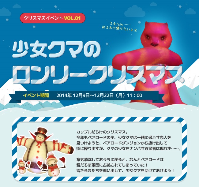 ラペルズは本日より、クリスマスイベント第一弾として「少女クマのロンリークリスマス」を開始いたしました。このイベントでは、ハック&スラッシュ型ダンジョン「ベアロード」を舞台に、可愛い雪だるまたちが大暴れ!住処を追われたベアロードのボス「少女クマ」を助けてあげると、このイベントでしかテイミング出来ないユニーククリーチャー「大きな雪だるま」のテイミングカードを入手することが出来ます。その他にも、サンタさん風のコスチュームなど、是非GETしたいアイテムがたくさん!どなたでも楽しめるイベントとなっていますので、今年のクリスマスはラペルズでお過ごしください!