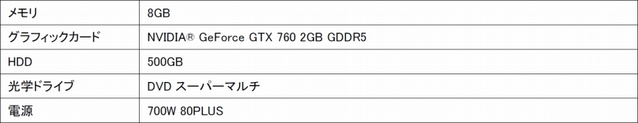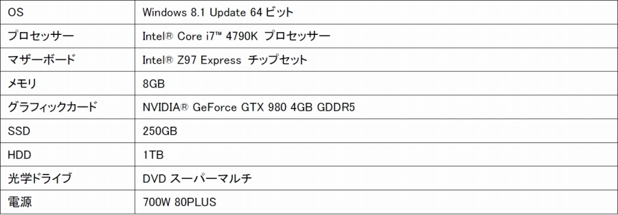 「GS7100-LCi7-VMRB-FFXIV」はプロセッサーにCore i7-4790K、グラフィックにGeForce GTX 980、メモリに8GB、250GBのSSD、1TBのHDD、OSにWindows 8.1 Updateを搭載しています。