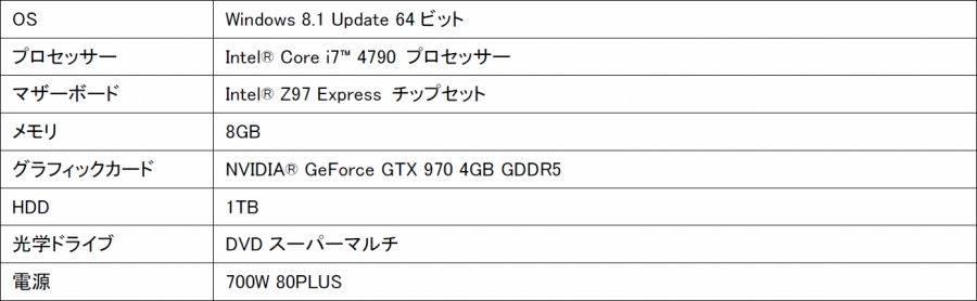 「GS7100-i7-TMB-FFXIV」はプロセッサーにCore i7-4790、グラフィックにGeForce GTX 970、メモリに8GB、1TBのHDD、OSにWindows 8.1 Updateを搭載しています。