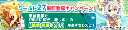 以下の期間中に「メガミエンゲイジ!」ワールド27に事前登録していただいた方全員に、「遥かに仰ぎ、麗しの」の「榛葉 邑那(S)」をプレゼントします!