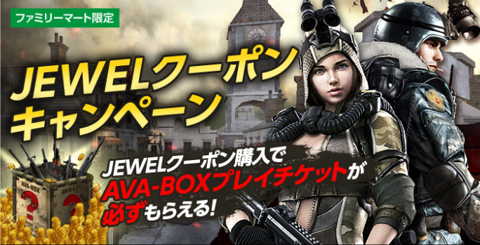 期間中、全国のファミリーマート店舗に設置しているマルチメディア端末「Famiポート」で「JEWELクーポン」をお買い求めいただくと、「JEWELクーポン」の購入金額に応じた枚数分の「AVA-BOXプレイチケット」のシリアルコードがもれなくついてきます。