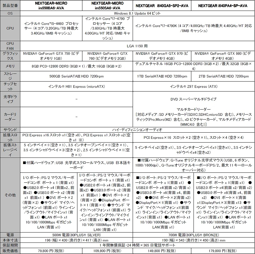 「AVA」をプレイ可能なエントリーモデルとして、最新のCPUとミドルスペックのグラフィックスを搭載しつつも7万円台という低価格を実現した、「NEXTGEAR-MICROシリーズ」より、インテル Core i5-4460プロセッサー、8GBメモリ、500GBハードディスク(7200rpm)、NVIDIA GeForceGTX750、80PLUS SILVER認定取得500W電源、Windows 8.1 Updateをプリインストールした「NEXTGEAR-MICRO im550BA6-AVA」を7万9,800円(税別)でリリースいたします。