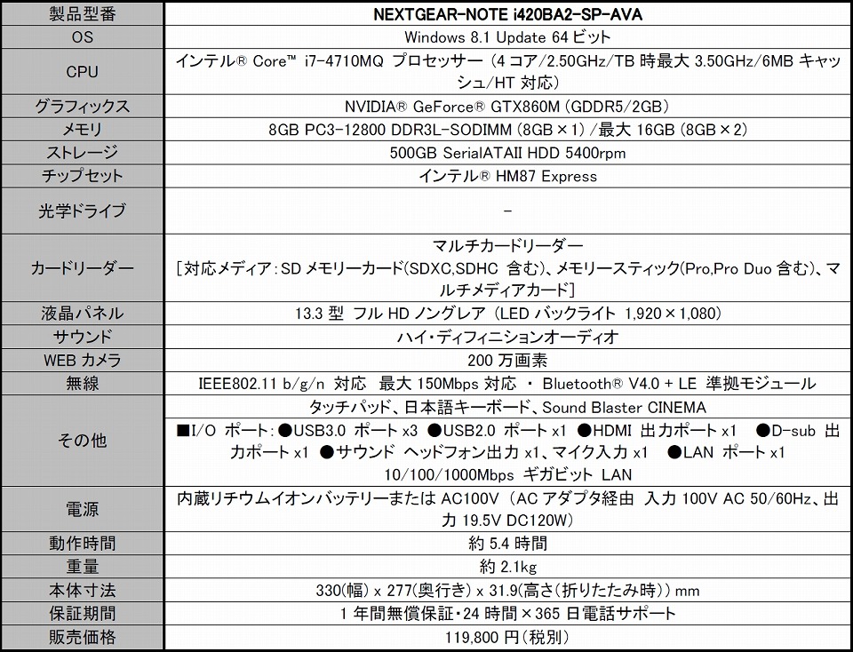 外出先でも「AVA」を体感できるエントリーモデルの13.3型モバイルゲーミングノートパソコンとして、インテル Core i7-4710MQプロセッサー、8GBメモリ、500GBハードディスク(5400rpm)、NVIDIA GeForceGTX860M、Windows 8.1 Updateをプリインストールした「NEXTGEAR-NOTE i420BA2-SP-AVA」を11万9,800円でリリースいたします。