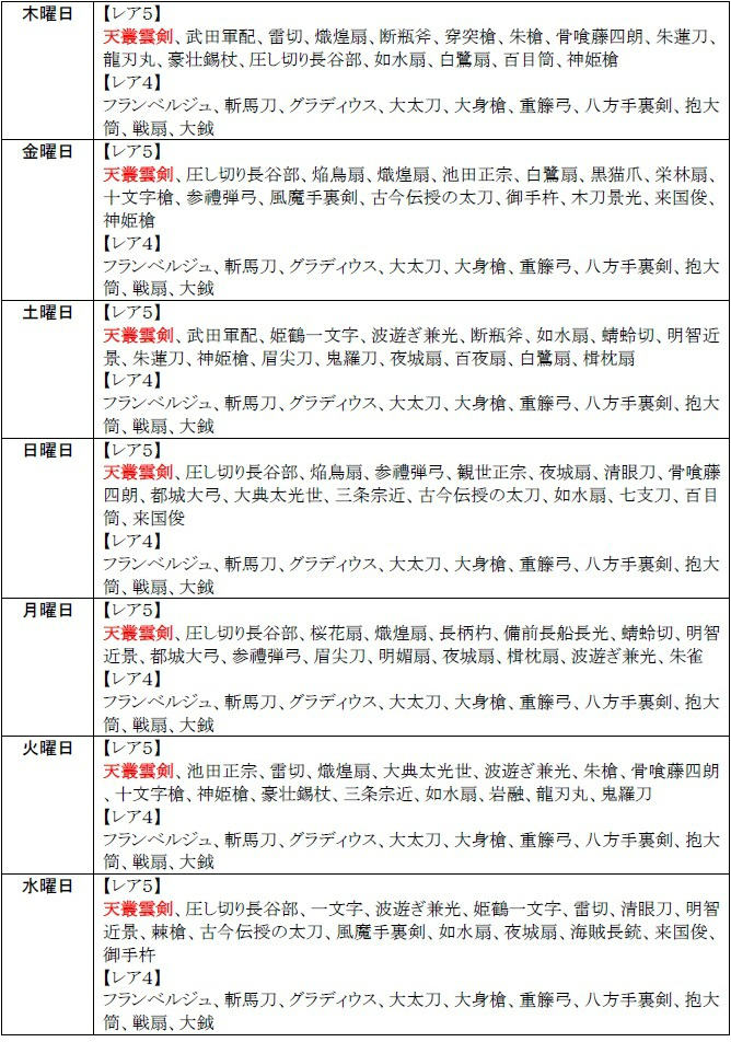 「匠魂くじ」からは各種レア4武器と「豪将くじ」に登場する武将の専用武器、そして「天叢雲剣」が登場し、専用武器は「豪将くじ」と連動して毎日15時頃に「豪将くじ」に登場する武将の武器に入れ替わります。