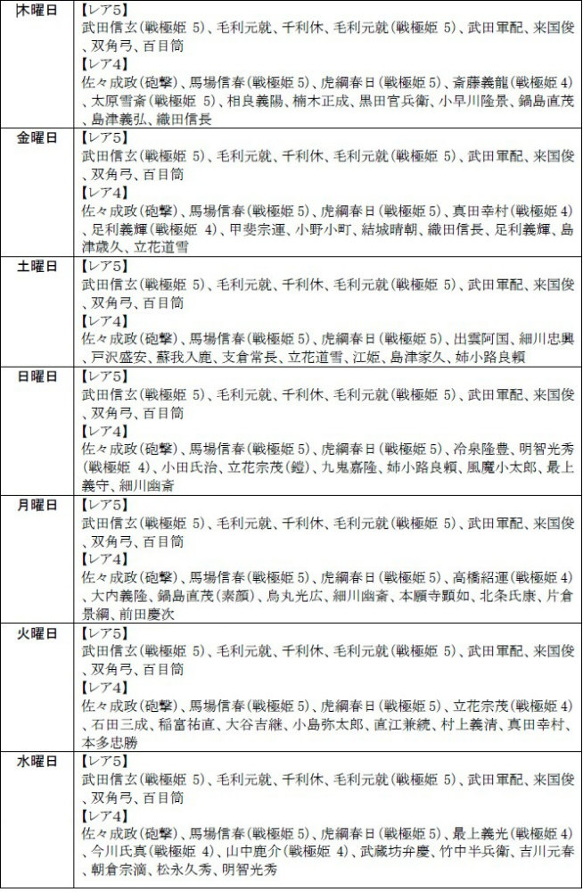 そしてなんと!土日の週末限定で今回追加される四名の武将の出現率が上昇しちゃいます!なお確率が上昇する期間は、クジの中身が切り替わる土曜日の15時から月曜日の14時59分までとなります。