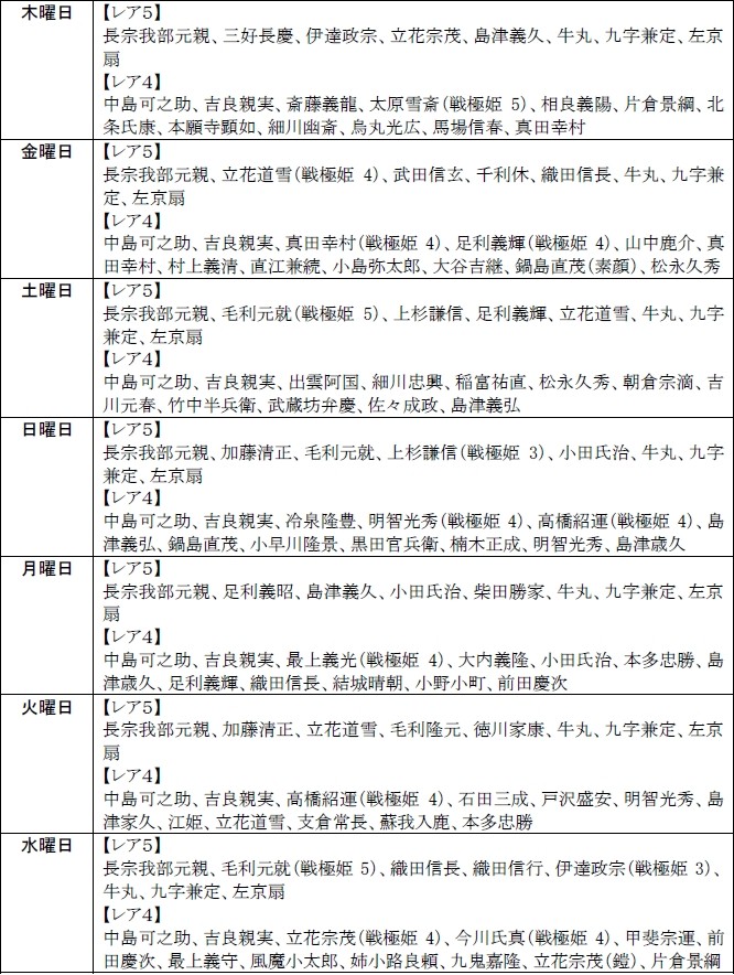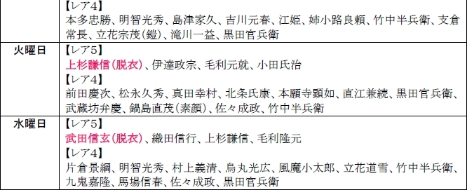 今週の「豪将くじ」の日替り武将は、レア5の脱衣武将が登場します!日替り武将の出現率は若干高められているので、欲しい武将が登場する日を狙ってみよう!