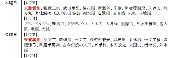 「匠魂くじ」からは各種レア4武器と「豪将くじ」に登場する武将の専用武器、そして「天叢雲剣」が登場し、専用武器は「豪将くじ」と連動して毎日15時頃に「豪将くじ」に登場する武将の武器に入れ替わります。