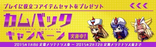 2015年1月8日(木)定期メンテナンスから、「カムバックキャンペーン」を実施中です。キャンペーン対象者には、10 連のロボコイン募集ができる「RC 募集チケット(10 連)」や装備などが手に入る「おかえりボックス」をプレゼント!ぜひこの機会にカムバックをご検討くださいね♪