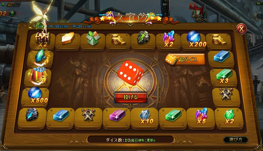 ダイスを投げて、マス目を移動します。止まったマス目のアイテムや金貨等を入手できます。1日2回まで無条件でプレイできますが、40万金貨でダイスを購入することで再度プレイすることができます。