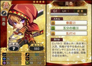 G4三顧の礼(2):ノーアウトで一二塁に走者がいるか満塁の時、100%の確率で三重殺に打ち取る。G7丞相(4): 試合開始時、味方全員の全能力が4%上昇。試合終了まで持続。