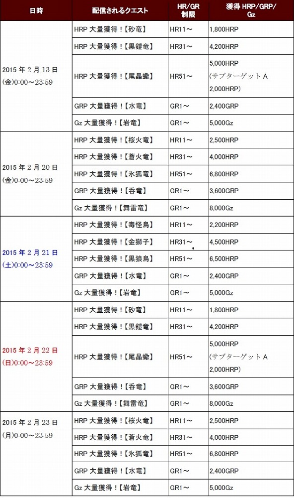 毎月3日、13日、23日、30日、31日と第3週末にHRP/SRPを大量にもらえる「HRPたっぷりクエスト」、GRP/Gzを大量にもらえる「GRP/Gzたっぷりクエスト」を配信いたしますので、皆さま奮ってご参加ください!