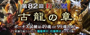 第82回狩人祭「古龍の章」では、「古龍」の通常試練の獲得魂数が大幅にアップ!また、ボーナス試練は「古龍」が登場するクエストからのみ選定され、魂数は「49魂」と「99魂」のみとなっています。