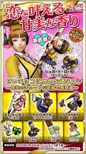 下記日時におきまして、使用時にユニークな効果音が聞こえるオリジナル武器「シュガード・ロール」(ガンランス)の生産素材を入手できるバレンタイン限定イベント「恋を叶える甘美な香り」を開催いたします。