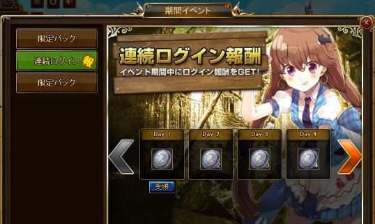 2015年2月10日(火)12:30 ~ 2015年3月11日(水)11:30 の期間中、1日1回ゲーム内にログインすると、ログイン日数が+1され、ログイン日数に応じてプレゼントが入手できます。