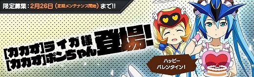 2015年2月12日(木)定期メンテナンスにて、バレンタイン限定の「【カカオ】ライガ様」と「【カカオ】ポンちゃん」が参戦いたしました。彼女たちは限定募集から仲間にすることができ、それぞれに「【EX】シリーズ」と同等のレアリティとなる「【ミルキー】シリーズ」が存在します。