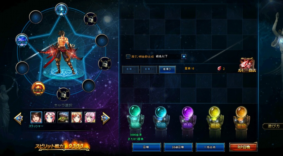 1.金貨または星章を使用してスピリットを「召喚」することができます。「召喚」に必要な金貨もしくは星章は、召喚クラスによって異なります。召喚クラスはランダムで変化します。「RP召喚」では、さらに強力なスピリットを入手することができます。