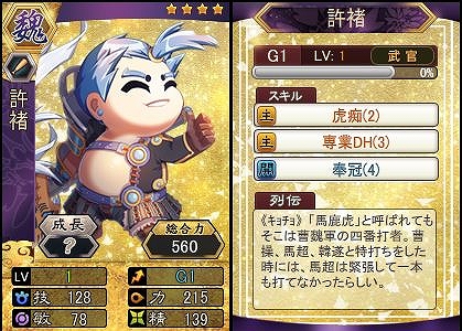 | G7 | 虎豹騎(4) | 「魏」の選手がチーム内に7人以上いる時、12%確率で安打を打つ。 |