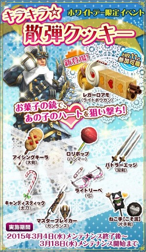 本日より、クッキーがモチーフのオリジナル武器「レガーロアモ」(ライトボウガン)の生産素材が入手できるホワイトデー限定イベント「キラキラ☆散弾クッキー」を開催いたします。さらに、歴代のホワイトデーオリジナル武器7種の生産素材も入手できます。