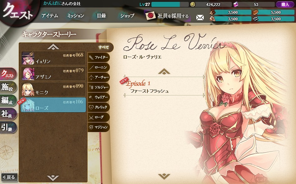 3月6日(金)メンテナンス後から3月20日(金)メンテナンス前まで、キャラクターストーリーに新しくエピソードが追加された社員4人から履歴書が届く確率が上昇します。