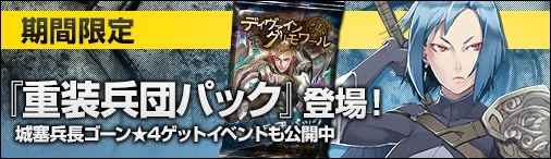 ベクターは、「ディヴァイン・グリモワール」において、本日3月11日よりカードパック「重装兵団パック」を販売、「城塞兵長ゴーンGETキャンペーン」および「ご新規様限定!赤ずきん&初心者応援キャンペーン」を開始した。