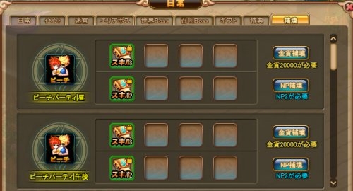 前日に参加していなかったイベントの報酬を受領できる機能です。補填の実行には金貨またはNPが必要となります。