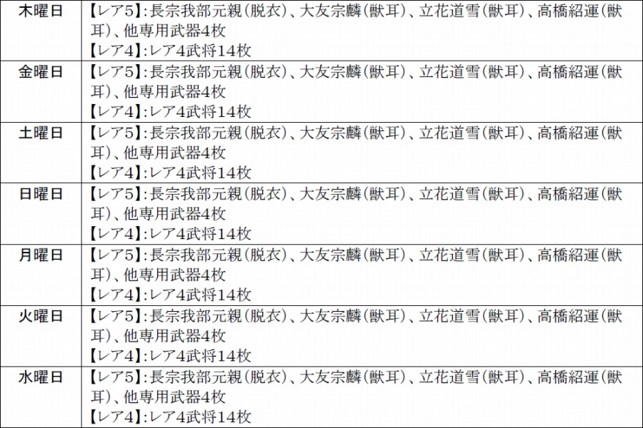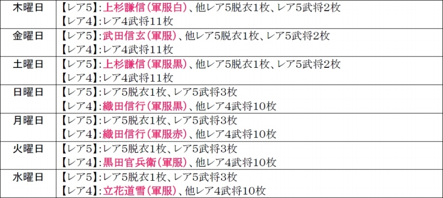 今週の「豪将くじ」の日替り武将はレア4とレア5の軍服コスチュームや通常レア5枠に脱衣武将が登場します!日替り武将の出現率は若干高められているので、欲しい武将が登場する日を狙ってみよう!
