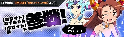 2015年3月12日(木)定期メンテナンスにて、ホワイトデー限定の「【ホワイト】ガイちゃん」と「【ホワイト】バド」が参戦いたしました。彼女たちは限定募集から仲間にすることができ、それぞれに「【EX】シリーズ」と同等のレアリティとなる「【ギフト】シリーズ」が存在します。