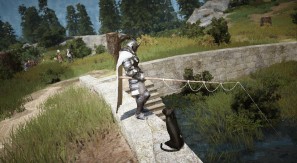 「釣り」は、川・海などの水があるところで行うことができ、地域によって釣れる魚の種類が異なります。釣った魚は、「料理」や貿易品として使用でき、「釣り」レベルが上がれば、使用できる釣竿の種類が増えたり、より大きな魚を釣ることも可能です。